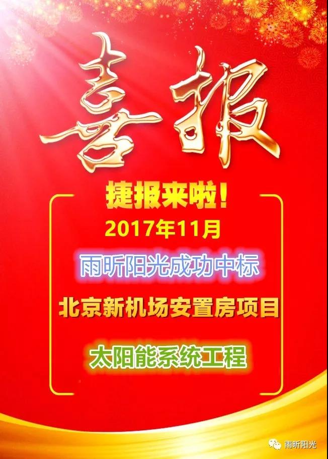 2017年11月,雨昕陽(yáng)光中標(biāo)北京新機(jī)場(chǎng)安置房項(xiàng)目太陽(yáng)能系統(tǒng)工程,總合同額約1600余萬(wàn)元,項(xiàng)目共計(jì)兩個(gè)標(biāo)段:北京新機(jī)場(chǎng)安置房項(xiàng)目(禮賢組團(tuán))1標(biāo)段(0107地塊)太陽(yáng)能系統(tǒng)工程項(xiàng)目和北京新機(jī)場(chǎng)安置房項(xiàng)目(禮賢組團(tuán))2標(biāo)段(0110、0111地塊)太陽(yáng)能系統(tǒng)工程項(xiàng)目。